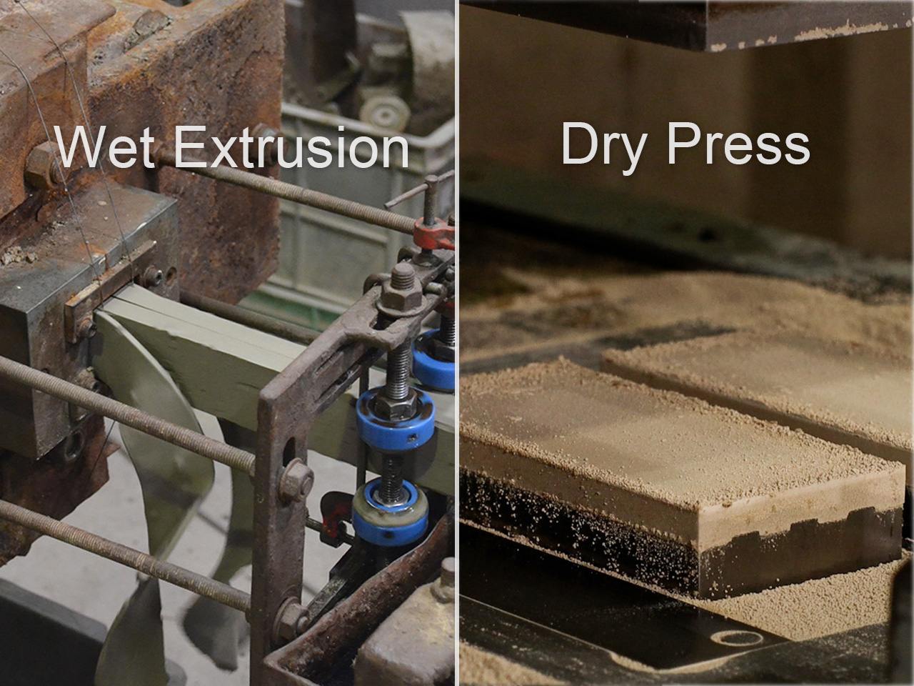 タイルづくりには大きく分けて2つの手法があります。水分を抑えた顆粒粉状の原料を型で固める「乾式成形」と、水分を含ませた原料の粘りを活かす「湿式成形」です。
