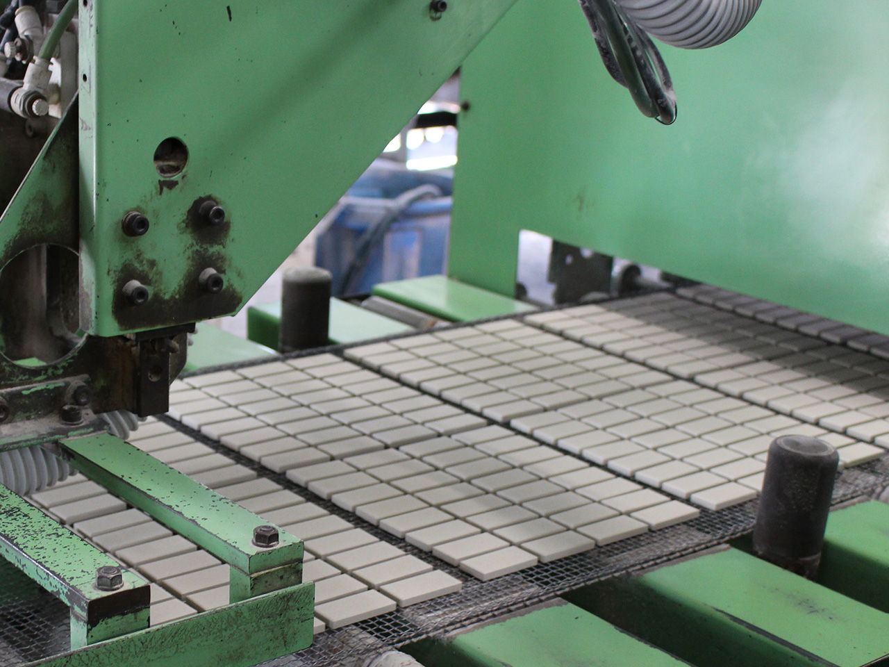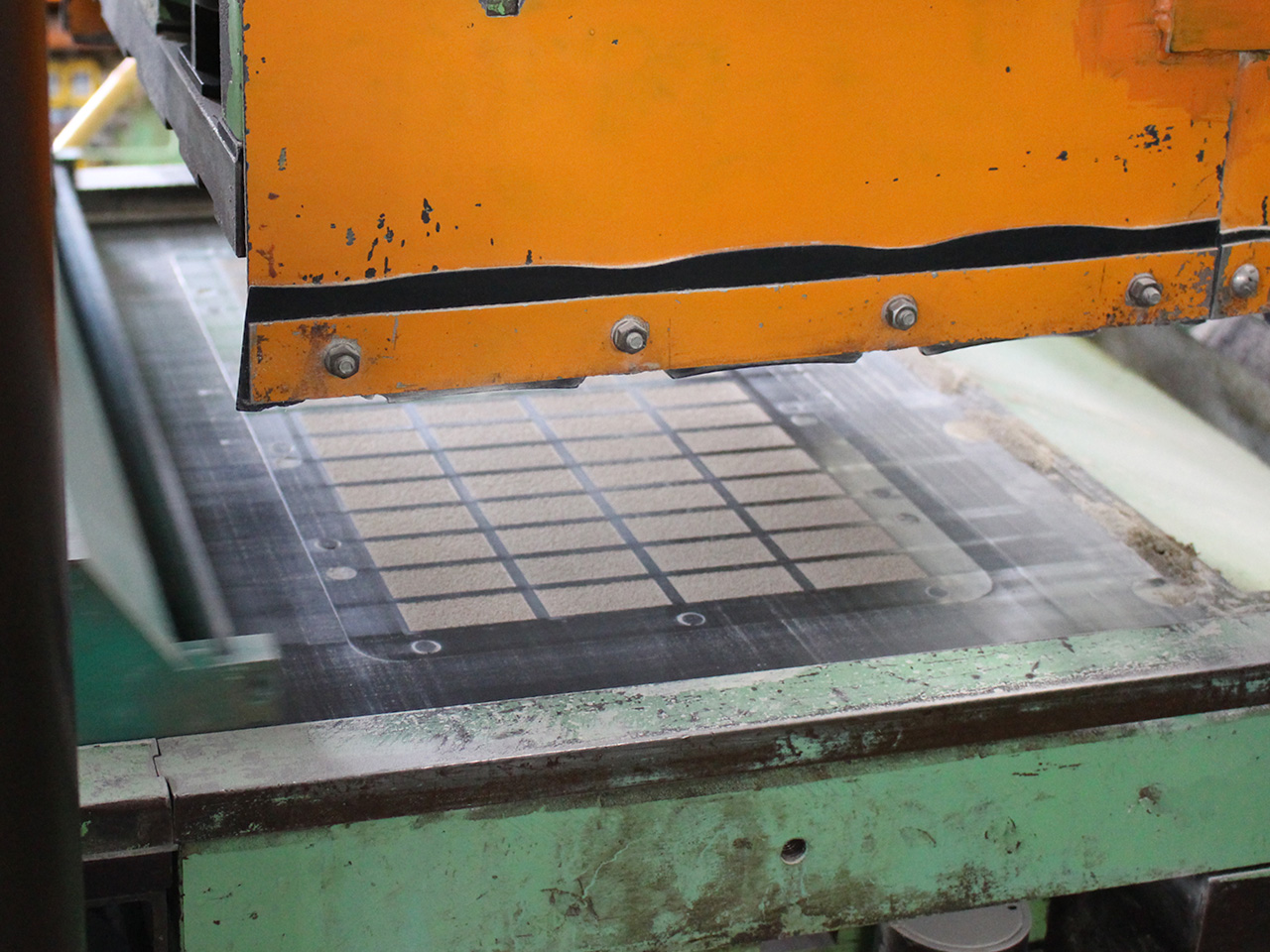 タイルづくりには大きく分けて2つの手法があります。水分を抑えた顆粒粉状の原料を型で固める「乾式成形」と、水分を含ませた原料の粘りを活かす「湿式成形」です。