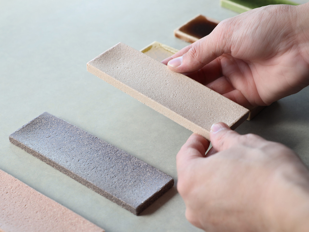 釉薬で表面を覆わない無釉タイルは、製造時に起こるわずかな差や焼成ムラなどが、そのまま製品の表情として現れます。